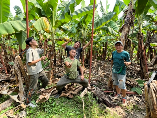 高雄旗山溪洲社區早期以種植香蕉為主且出口日本聞名,近幾年來少子化與高齡人口影響當地農業發展,許多農家子弟選擇移居市區或是海外,當地有許多獨居老人,年輕勞動人口持續下降,香蕉收成價長期被盤商剝削,農事人口長期缺工,造成香蕉果園出現無人管理,荒廢與農田遭倒廢土時有所聞,對於環境保護與社區發展面臨嚴峻考驗.本團隊與當地NPO合作成立守望互助隊,提供整理果園/採收/農業廢棄物回收服務,主動協助不便年長的農友,也幫忙社區收集農業廢棄物(非生物)如農膜/培育盤/穴盤等,後續導入再生系統,推動綠色循環經濟
