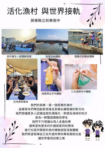 返鄉創(就)業青年的回歸,讓我們的家鄉變得更有活力,他們努力在產業中尋找創新與環境永續的做法,並且共同為社區發展做出許多貢獻,例如設計體驗遊程、在地餐桌、淨灘活動、食農及食魚教育推廣…,為家鄉帶來國內外的觀光人潮。但是我們發現,社區並沒有開發完整的雙語導覽手冊及雙語導覽人員,我們是一群雙語實驗班學生,進行過漁村體驗遊程,深深地被社區及返鄉青年的努力所感動,因此我們希望能夠為社區進行盤點及開發完善的雙語遊程體驗措施,讓枋寮為永續發展的努力被世界看見!