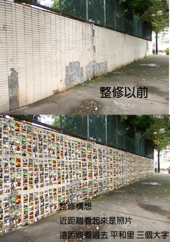 台中北屯區平和社區屬住宅學區,里民和諧,但想延續下去困難,社區更和諧,將人與人的距離更拉近,平和社區發展協會早已有構想與實行能力目前正在建構網站,建構里的活動店面交流整合,但在平和里的入口處的圍牆,磁磚卻殘破不堪,想將這面牆壁,創造一個,平和社區唯肖(微笑)時光迴廊,將里民的努力工作,微笑,參與活動,平和里歷史用熱感烙印在磁磚牆上,做個時光迴廊,需要千張里民微笑照片烙印磁磚貼牆面上,往後的10年20年將會是平和里里民印象中里民永遠回顧的地方,讓人與人的距離更拉近更和諧.用笑容感染每個人心理感受