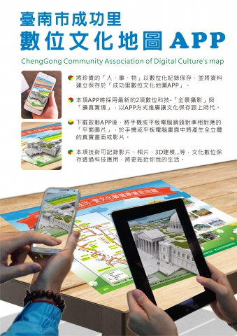 一、開會討論APP紀錄項目 初步製作內容: 1.特色景點十點,全景攝影並紀錄四季變化 2.耆老口述錄影二人 3.重要節慶紀錄二場 4.特色建築物四棟 5.文化健康步行路線規劃-開創成功、體驗文化 健走地圖 6.文化體驗自行車路線規劃-成功騎跡 美食文化地圖 二、里民大會討論工作分配及要點說明 1.工作小組任務分配 2.拍攝、錄影時間地點排程決定 3.所需器材採購決議 三、數位影像後製剪輯製作 1.首拍照片、影片公布討論 2.數位記錄補強 3.委由專業公司剪輯後製 四、成功里文化地圖紙本繪製 五、成功里文化地圖網站製作 六、文化地圖網站使用推廣 1.透過里民大會說明網站使用方式 2.里民上傳照片、影片教學 七、成功里數位文化地圖APP製作 1.APP程式開發製作 2.APP程式除錯、數位資料補強 3.APP上架,提供免費下載 八.APP使用教學推廣 1.於里內舉辦APP使用教學課程 2.與里內各學校合辦APP使用教學課程 3.製作宣傳用文宣資料放置於十鼓、奇美博物館 九、APP相對應點硬體製作 1.景區、公車站、十鼓、奇美博物館相對應點設置 十、辦理「成功里數位文化地圖APP」發表記者會