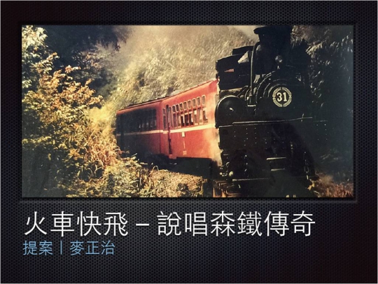 「火車火車欲起走 阿里山ㄟ小火車 火車火車到竹崎 枝仔冰涼涼透心肝 火車火車欲爬崎 嬰嬰歪歪搖阿搖 鑽碰孔 過山嶺 樟腦寮 香蕉買來吃 火車火車暈車車 獨立山 8自行 火車火車過山拼 雲霧入窗緊搭杉 火車火車停佇這 交力坪肉粽買一肝 ……」 「火車快飛—說唱森鐵傳奇」將分為籌備、實際拍攝、後製,以及 傳播行銷等幾個階段。首先將進行阿里山森林鐵道沿線的耆老訪談、蒐集老照片與翻拍,以及社區動員邀請大家參與影片的演出。可藉此掌握創作內容正確,並帶動社區一起重溫往日時光,喚醒社區意識,為日後的社區經營奠定基礎。 文字記錄、拍照與影片拍攝和製作等,將邀請過去一直參與畚箕湖文史工作室的地方媒體朋友、文字工作者、紀錄片工作者等一起加入工作行列。光碟完成後,推廣方式將包括,和有關單位的結緣,如阿里山國家公 園管理處。成為山區志工群的訓練教材(導覽訓練)、並接受邀請到各處說唱行銷與推廣地方人文。另外,在各友好網站的協助鋪貨、架設自有網站行銷阿里山森林鐵道與光碟。與電信業者合