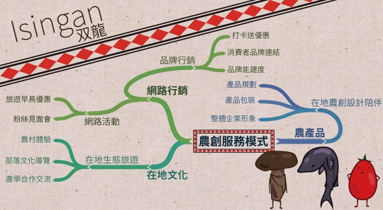 美食蘊含豐富的土地情感,而旅行是體驗的絕佳方案。本計畫目標為活化在地農創產品,建立地方品牌形象。因利用雙龍做為品牌識別的整體形象,能讓部落中所有的生產者一同提升競爭力。雙龍部落目前有段木香菇、番茄以及養殖鱘龍魚…等農產品需要建立自有品牌。本計畫將製作以雙龍為主框架的視覺行銷設計。並配合Facebook粉絲專頁,在雙龍部落規劃規劃周休二日的短期深度旅遊行程,如:段木香菇種植及採收體驗、番茄園採摘及種植技術觀摩、客戶感恩園遊會…等。以體驗行銷與整合行銷的角度,在雙龍部落地區規劃深度旅遊行程。雙龍部落有十分具特色的景點與景觀,遊客能在當地聆聽原民講述部落的古早神話故事,並體驗部落中豐富的自然生態景觀。同時以打卡優惠等網路行銷手段搭配農村體驗活動,吸引更多潛在顧客進入農村感受在地文化。預期不僅為農戶帶來實質的收入增加,更因將消費者帶到生產端。而能能透過外溢效應影響部落中其他農戶一同整合提升競爭力,達到共好的行銷方式。而透過網路行銷的特性,也能夠大幅降低行銷的成本,讓脫離盤商的農戶更有獨立營運的能力。