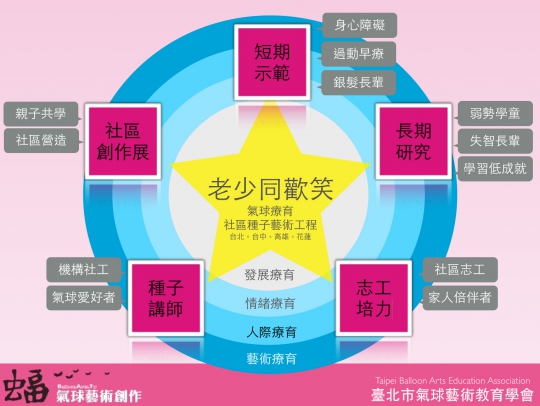 一、人員架構 1.計畫主持人 李承澔 臺北市氣球藝術教育學會理事長/藝術碩士/世界冠軍 2.顧問 陸雅青 教授 台灣藝術治療學會創會理事長/台北市大專任教授 3.研究招集人 周光昭 40年專業輔導心理諮詢師 4.研究員 陳盈傑 中山大學教育所博士研究/國中輔導老師 鄭如珊 國際氣球藝術師認證/社區大學講師 二、服務對象與場次 主要以過動早療親子及失智銀髮長輩兩大族群,共計53場次的課程及展覽活動,預計服務3000人次的個案、志工、種子講師及參觀民眾。 1.短期示範教學 台北:麥當勞叔叔之家、台灣赤子心過動症協會 台中:弘道老人、曉明老人 高雄:方舟養護之家、高雄市注意力缺陷過動症協會 花蓮:門諾基金會、光復老人日照 2.長期研究教學 台北:第一社福、天主教失智老人 台中:大德國中青少年、高關懷、特教生 3.社區志工培力 台北、台中、高雄、花蓮 4.種子講師培力 台北、台中、高雄、花蓮 5.社區創作展 台北:萬華社區 台中:西屯社區 三、預期成效 1.發展療育:肢體、運動、律動 2.情緒療育:成就、自信、專注 3.人際療育:同儕、親子、手足 4.藝術療育:創造性、社區參與、社區營造