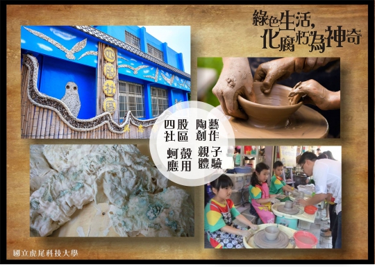 某個假日,本小組來到位於鰲鼓溼地中的四股社區,看到許多居民在剝蚵,雖然社區將蚵殼黏貼為牆面藝術,但堆積如山的廢棄蚵殼還是環境的一大負擔,因此觸發本小組思考廢棄蚵殼再利用的可能性。 本小組將運用生物科技的技術,使用酵素,分解蚵殼,並過篩,得到細緻潔白的蚵粉,希望與陶土結合,帶領當地小朋友,一起創作出具有廢棄資材再利用的生態藝術作品。 四股社區位於鰲鼓溼地的出入門戶,當地居民多以漁業為生,因此與生態間一直有頻繁的互動關係,透過自然廢棄資材的再利用,讓小朋友重新認識和連結自己的社區和周遭的生態環境。