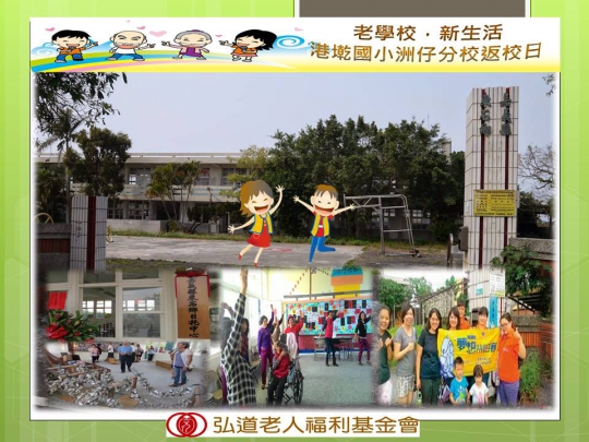 弘道老人福利基金會長期致力於長輩「在宅安老」理念,實踐社區照顧,並透過「不老夢想」讓長輩活出精彩,走向陽光。107年起長期駐點嘉義縣東石鄉港墘國小附設洲仔分校,結合在地深耕的嘉義縣鄉村永續發展協會,透過融合在地相同的生產條件、生活形態、自然與人文環境形塑共同生活圈,以建構一個安居樂業的社區為終極目標。據此,提出老學校新生活的方案,尋找號召老學生、老老師、老鄰居的返校日活動,讓讓歷史生活風貌得以被紀錄並以記憶牆與影音檔形式留存,以之為基底重啟社區在地人、事、物的鏈結,擘劃出永續發展的新生活願景。