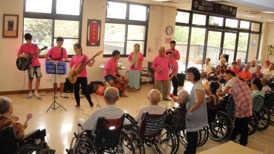屏東縣鹽埔鄉是個純樸的鄉下,在星期六晚上我們總會和孩子們一起練習樂器,吉他、二胡、鼓.有感於早期懷念歌曲現在小孩大都很少接觸也不會唱,所以我們特別會針對老歌,比如白牡丹、四季紅、南都夜曲…讓年輕人學習,傳唱。 我們常常將這些老歌帶到社區關懷據點、安養院,做關懷表演。當老人家聽到這些歌曲,融入歌聲中彷彿回到從前,臉上盡是滿滿的幸福感,就覺得很值得,想要一直地把歡樂帶給長者,想要一直做下去…