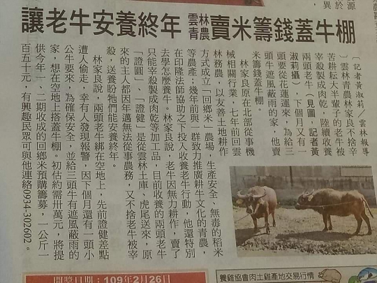 水牛之於農家,就如同現今廠房之於生產機具;在以往傳統農業時代,水牛不僅僅是替代勞動力的象徵,也是一個農家的命脈。更是代表了農耕時代最先進的生產力。自從我國加入世界貿易組織後,農業正面臨轉型期,休閒農業資源的開發利用正方興未艾,保護台灣水牛除了利用生物科技將此珍貴的遺傳資源永續留存在台灣的土地上,並可結合水牛牛車工藝與水牛役用之特性與地區休閒產業結合,而我,一個樸實無華的農民,如同海賊王角色中為了夢想,不斷找尋志同道合的夥伴,而水牛正是陪著我進行自然農法、友善環境生產的新夥伴。