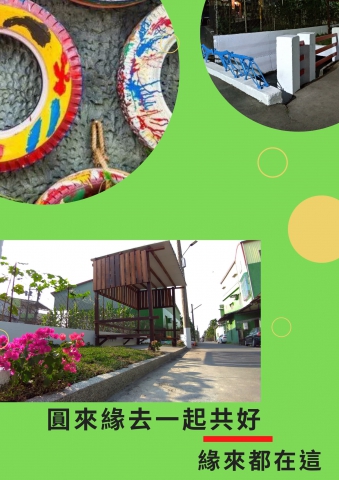 社區環境是需要大家一起來維護的,環保議題更是目前社會上最需要大家的關心,曾經的社區規劃師提案中,我使用了腳踏車的車架做出橋墩護欄也美化了社區,但還有其他的零件呢? 圓是圓滿的圓,是團圓的圓,是滿足的圓,用廢棄的輪胎做出新創的綠化道具來裝飾我的社區,從大貨車的輪胎到小至腳踏車的輪胎,只要是廢棄的輪胎都可以用來改造,不僅僅是彩繪,怎麼應用到社區上才是重點,針對社區現況的盤點,可以做出據點的蔬食種植容器,也可以做出美麗的花卉裝飾,將用來照顧我們的老寶貝(社區照顧關懷據點)與美化我們的環境。
