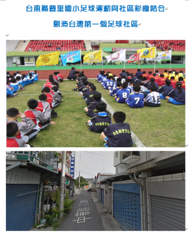 台東縣台東市豐里國小,是台東縣主要足球小選手培訓的小基地,豐里國小雖小,但透過學校從校長至每一位老師及專業的足球教練努力下,豐里國小足球隊在台灣的小學界已小有名氣。我是一位住在豐里國小附近社區的家長,想讓豐里國小更能有一個確實的足球地標,讓大家知道豐里社區中的豐里國小就是一個足球小王國,透過社區樣貌的改變結合(聯繫台東縣立寶桑國中尋求美術專班資源,集結國小附近住戶將其車庫大門彩繪成足球有關圖案,結合豐里國小努力推行的足球運動強項創造一個足球社區,讓全台灣看見這所小學對足球的用心及努力。