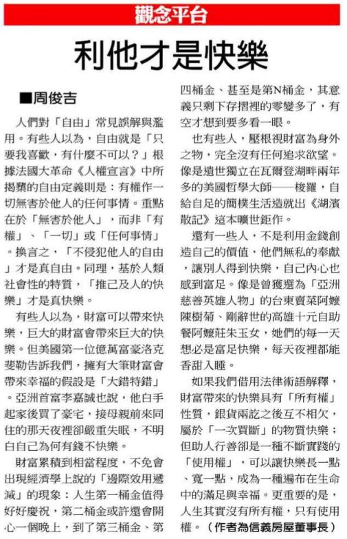 《中國時報》專欄:利他才是快樂