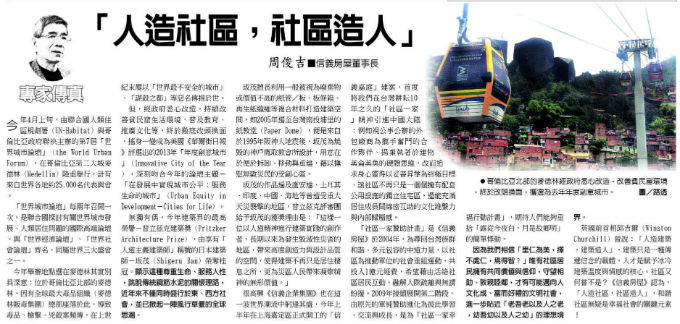 專家傳真-「人造社區,社區造人」2014年07月30日 01:25周俊吉信義房屋董事長小字型中字型大字型15點閱0/10 我要評比 0今年4月上旬,由聯合國人類住區規劃署(UN-Habitat)與哥倫比亞政府聯袂主辦的第7屆「世界城市論壇」(the World Urban Forum),在哥倫比亞第二大城麥德林(Medellin)隆重舉行,計有來自世界各地約25,000名代表與會。
