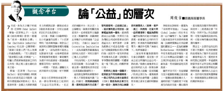 這些對比鮮明的新聞事件,教人不禁思索起所謂「公益」的層次。對商業組織而言,最常見的操作方式是「營利歸營利,公益歸公益」,追求獲利是公司宗旨,股東權益為第一優先;慈善捐款或公益活動,充其量只是為博取公司或經營者美名的表面功夫。更有甚者,企業為粉飾太平或沽名釣譽,從右口袋掏錢來收拾其左手闖的禍;就如同一家長年排放有毒廢水的工廠,卻定期大手筆贊助環保團體,明擺著是一種「買心安」的贖罪券行徑。