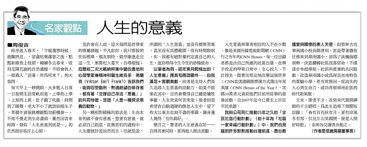 人生意義與筆者相仿的人不在少數,像是美國有線電視新聞網(CNN)行之有年的CNN Heroes,每一位出線者都是由自己所處的社區出發,在舉手投足的呼吸日常中,全心投入、不計得失、踏實而堅定地改變這個世界;CNN並透過網路票選方式選出年度英雄(CNN Heroes of the Year),加碼10萬美元資助他們目前所從事的慈善活動,自2007年迄今已產生上百位平民英雄。