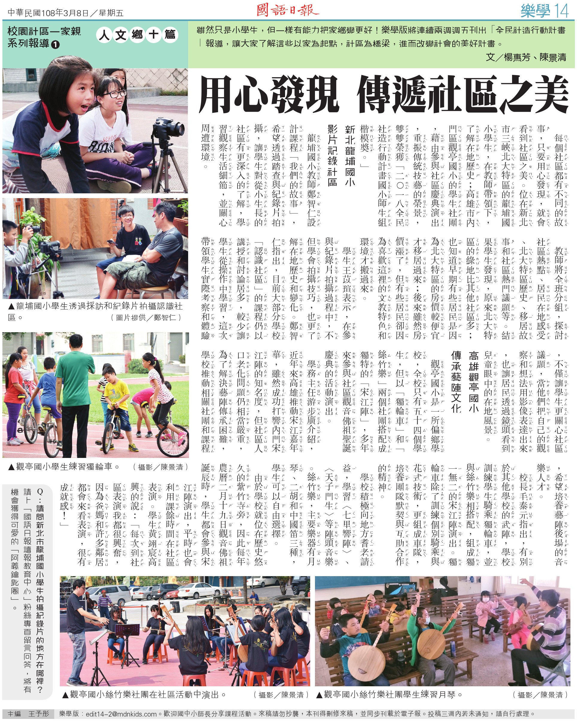 每個社區都有不同的故事,只要用心發現,就會看到社區之美。位在新北市三峽北大特區的龍埔國小學生,在教師帶領下,了解在地歷史;高雄市內門區觀亭國小的學生社團,藉由參與社區慶典演出,重振傳統技藝的榮景,雙雙榮獲「二○一八全民社造行動計畫國小師生組楷模獎。」