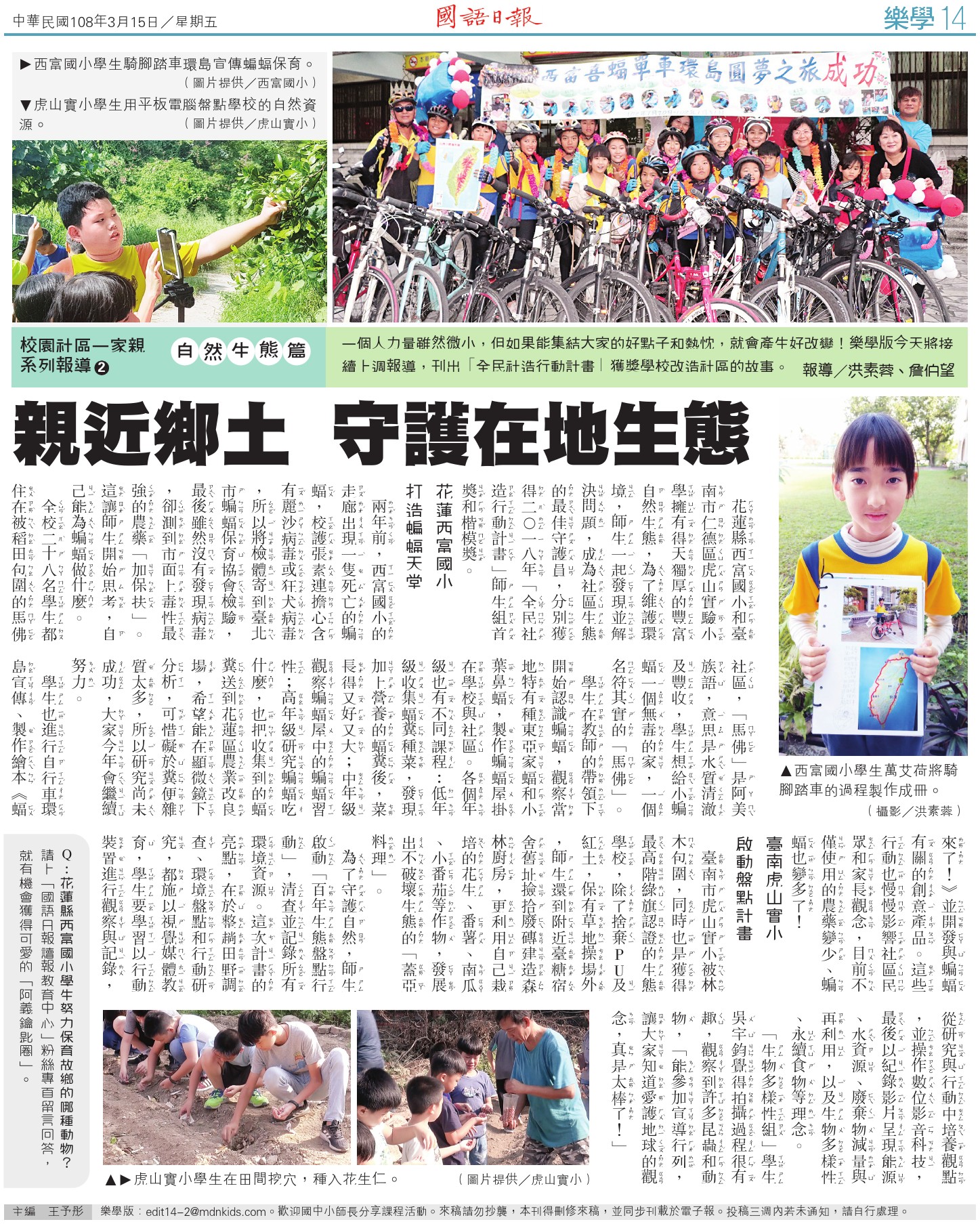 花蓮縣西富國小和臺南市仁德區虎山實驗小學擁有得天獨厚的豐富自然生態,為了維護環境,師生一起發現並解決問題,成為社區生態的最佳守護員,分別獲得二○一八年「全民社造行動計畫」師生組首獎和楷模獎。