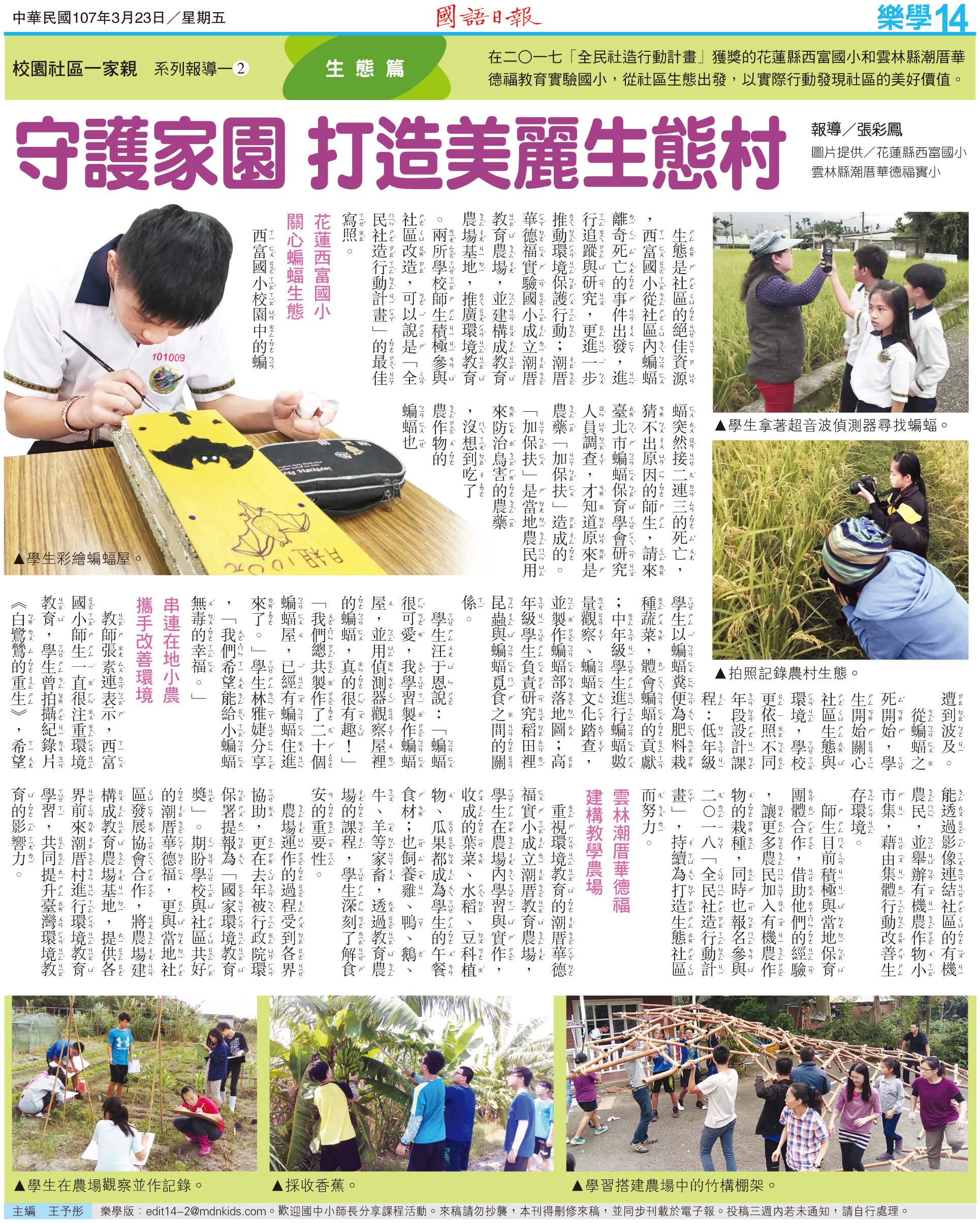 生態是社區的絕佳資源,西富國小從社區內蝙蝠離奇死亡的事件出發,進行追蹤與研究,更進一步推動環境保護行動;潮厝華德福實驗國小成立潮厝教育農場,並建構成教育農場基地,推廣環境教育。兩所學校師生積極參與社區改造,可以說是「全民社造行動計畫」的最佳寫照。