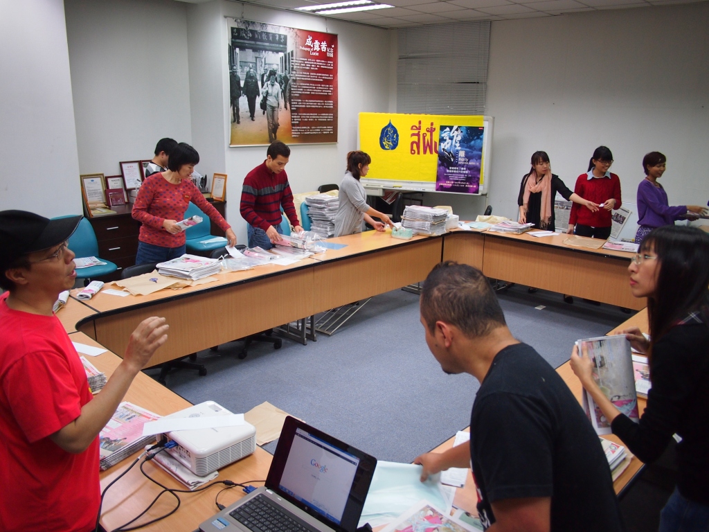 這天的見學活動,我們很高興可以跟《四方報》的工作夥伴一起談辦報的心得。為了尋求不同語言編輯人才的故事之外,還有各地宣傳時來自讀者回饋給他們的小感動。發言人雲章跟見學的夥伴分享了這份刊物帶給他們感動的一些小故事,我舉其中一則簡述:曾經有位在台灣工作的外籍女性勞工(以下簡稱為A君)來信,在A君工作的場所遇到了一個對她很好的台灣人(以下簡稱為B君),A君很困惑是否要接受對方的感情,於是她鼓起勇氣寫信到四方報詢問大家的意見,後來有許多讀者回信給A君,也給了她一些意見。雲章告訴我們,在幾年後的一次宣傳,她們覺得有位男士抱著小娃娃前來感到好奇,一聊了之後才知道,原來他就是B君,也終於讓工作夥伴知道了最後美麗的「結果」。