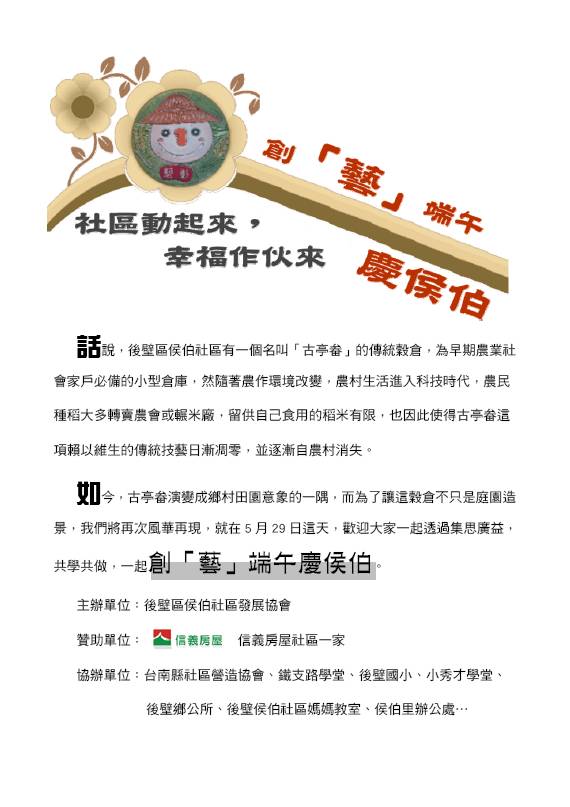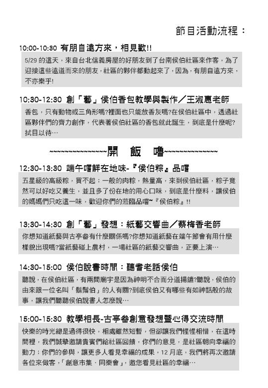 10:00-10:30 有朋自遠方來-活動行前說明 10:30-12:30 創「藝」侯伯香包教學與製作 12:30-13:30 端午嚐鮮在地味-侯伯粽品嚐 13:30-14:30 創「藝」發想:紙藝交響曲 14:30-15:00 侯伯說書時間-聽耆老話侯伯 15:00-15:30 教學相長-古亭畚創意發想暨心得交流時間 |