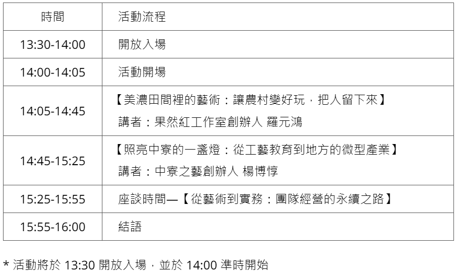 在這場講座裡,你可以了解返鄉青年如何以藝術作為媒介,連結社區居民、土地間的關係,並強化居民認同感,更吸引外來遊客到訪,活絡地方。透過社區實踐者現身分享,了解團隊經營經驗,獲得更多返鄉生活的靈感。