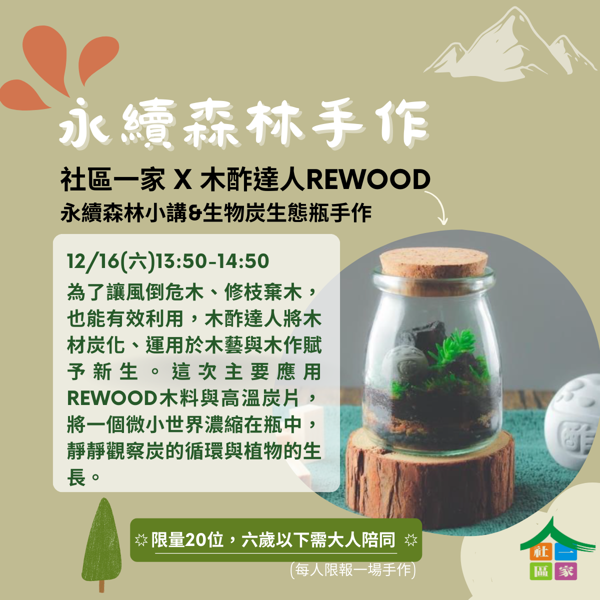 - 13:50-14:50>>《永續森林小講&手作坊--生物炭生態瓶》主講者:木酢達人REWOOD
