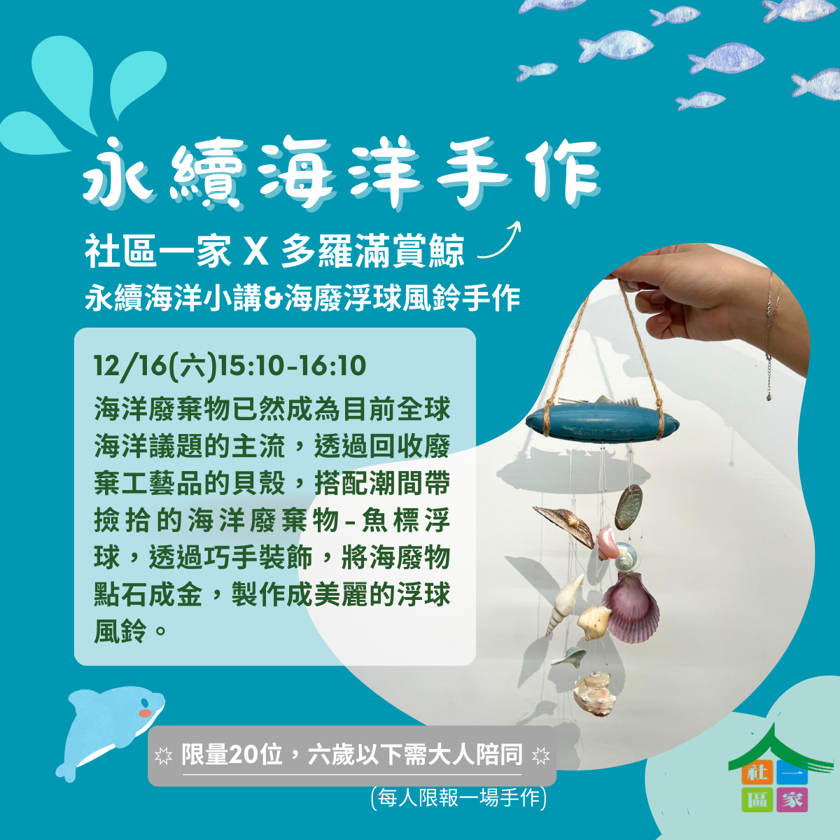 - 15:10-16:10>>《永續海洋小講&手作坊--海廢風鈴》主講者:多羅滿賞鯨