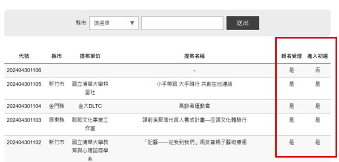 【全民社造行動計畫官網 → 提案計畫總覽→ 初選分數查詢】,