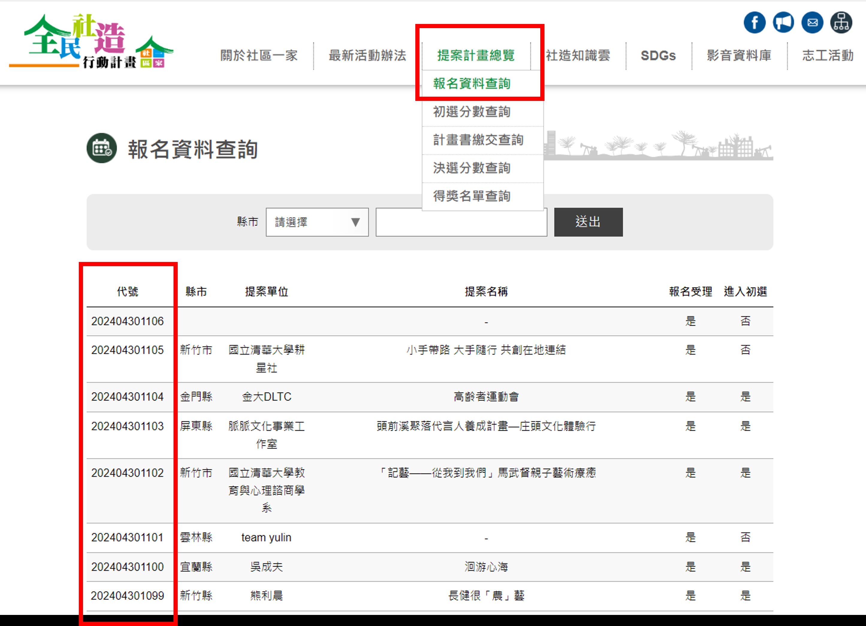 ※ 計畫編號查詢:社區一家官網→提案計畫總覽→報名資料或初選查詢→左邊的「代號」
