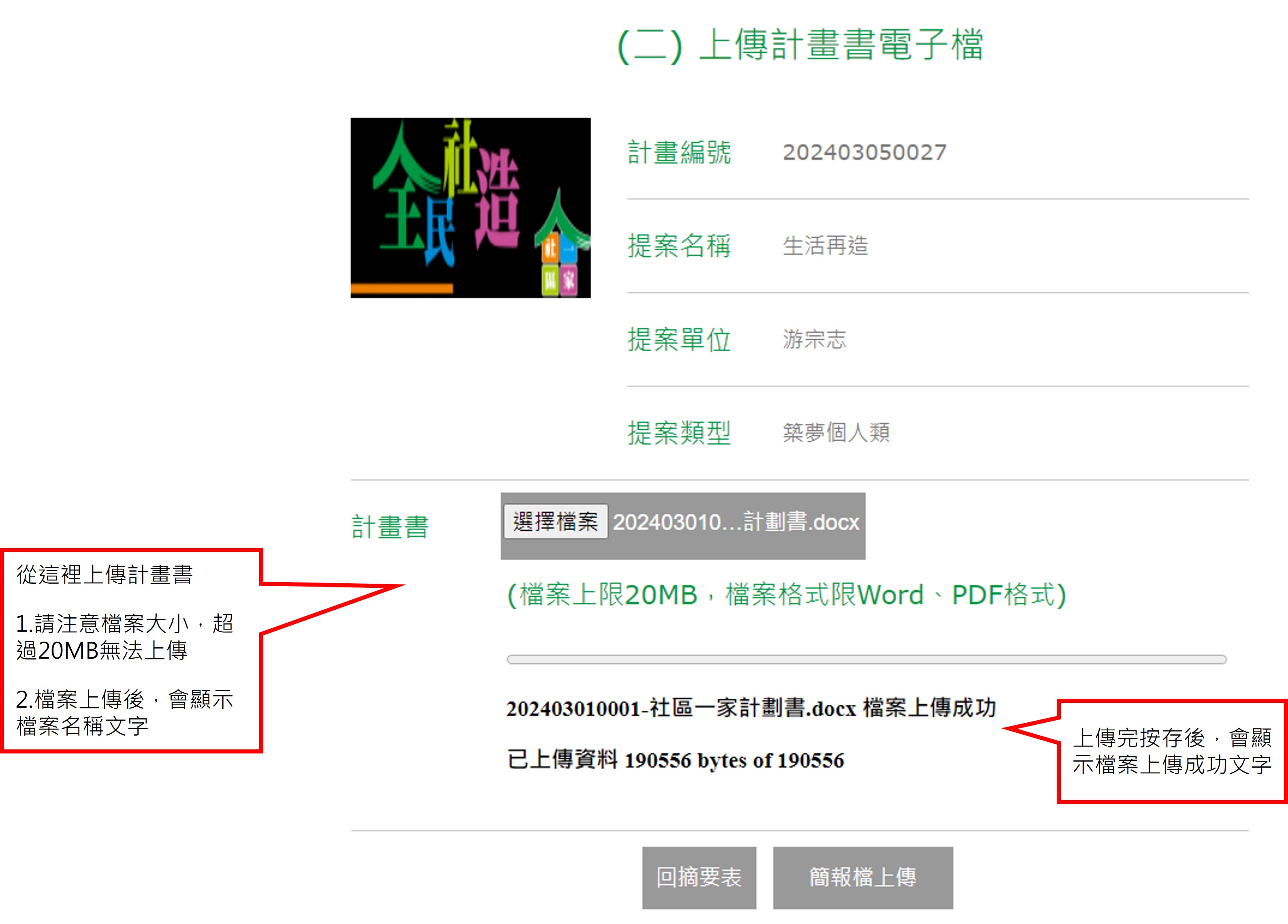 步驟六:請點選「選擇檔案」上傳計畫書電子檔,上傳限「WORD及PDF」兩種格式檔案,上傳成功會顯示「檔案上傳成功」
