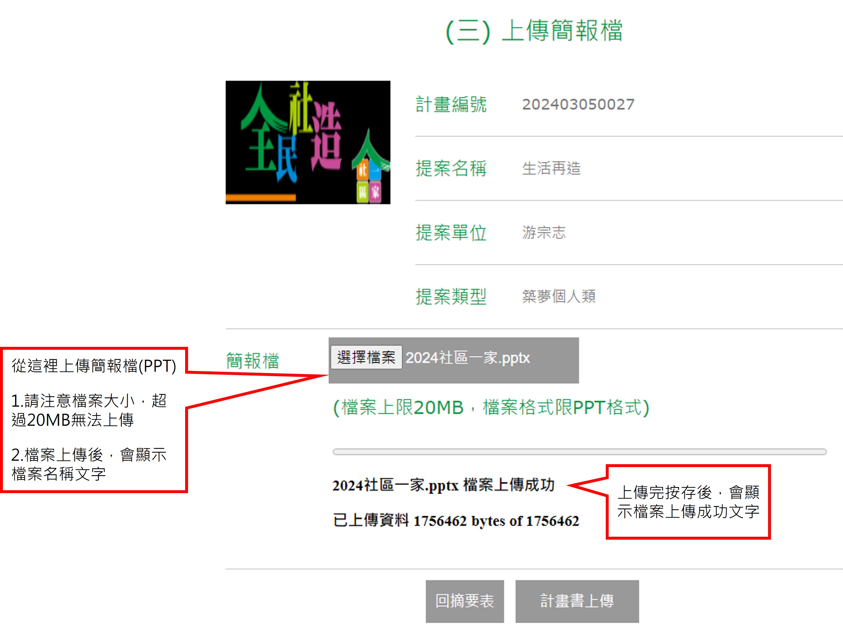 步驟七:請點選「選擇檔案」上傳計簡報檔,檔案格式以PPTX為限,無法受理其他格式,上傳成功會顯示「檔案上傳成功」