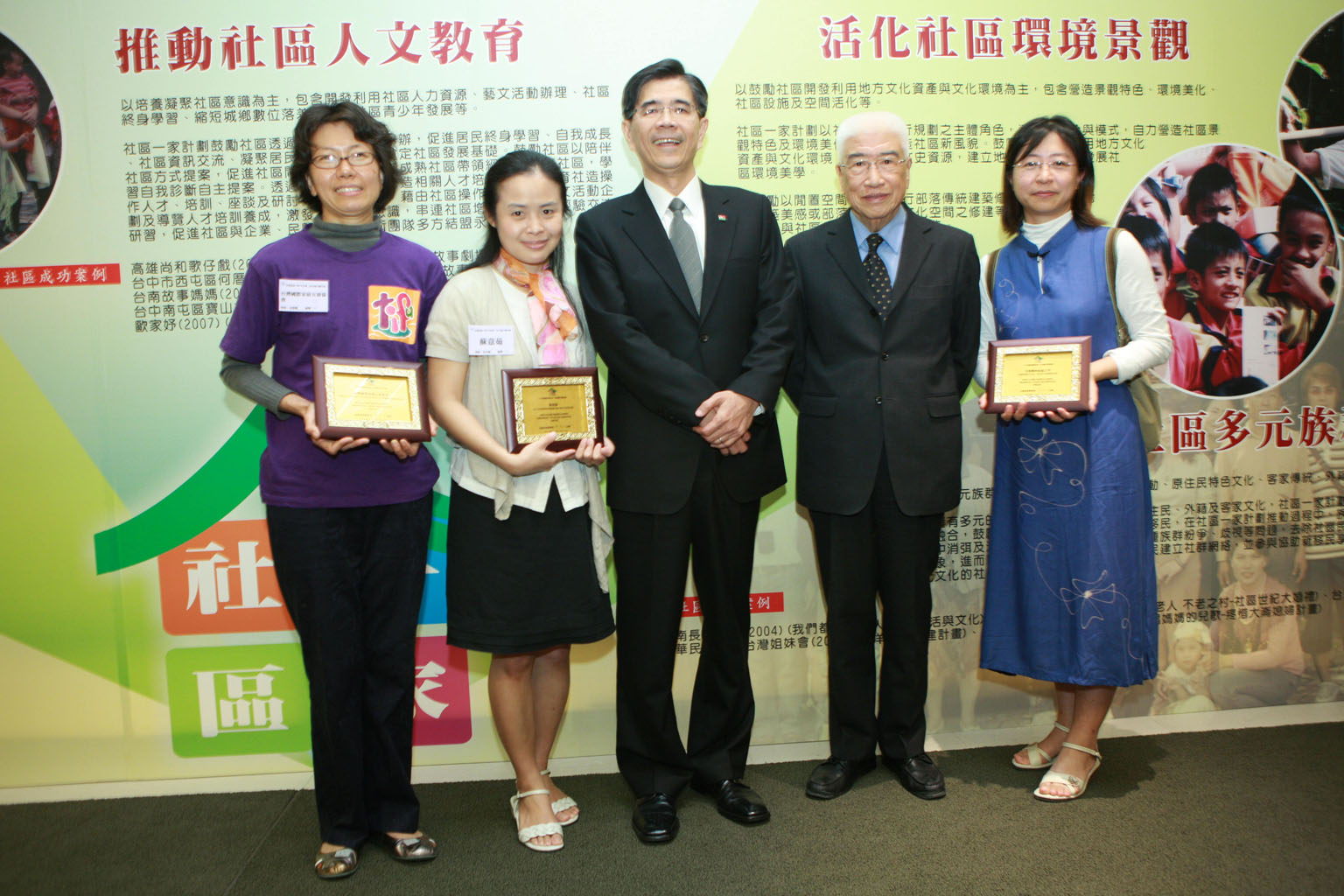獲得「2009社區一家幸福行動計畫」獎助的三位首獎與信義房屋周俊吉董事長及社區一家評審長柴松林教授合照。 左一為獲得「幸福社區類」首獎的台灣國際家庭互助協會代表張育華,左二為獲得「築夢個人類」首獎的蘇意茹,左三為獲得「理想社會類」首獎的花蓮鄉村社區大學發展協會理事張淑婷。