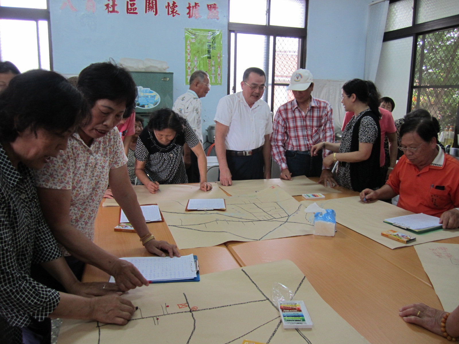 今日活動的早晨,社區夥伴及志工們首先進行弱勢族群的關懷,除了表達關心之外,也將訪示的過程記錄下來,做為後續緊急通報疏散撤離的連絡資料;在活動進行的過程,同步做田野調查,此調查的用意為了就是讓大家在下午繪製「防災地圖」時的事前準備工作;下午的活動先透過老師解講如何繪製及應該注意的方向後,大家分成五組進行防災地圖繪製的工作,藉由繪製地圖的過程,讓大家更了解疏散的路線和防災的概念。